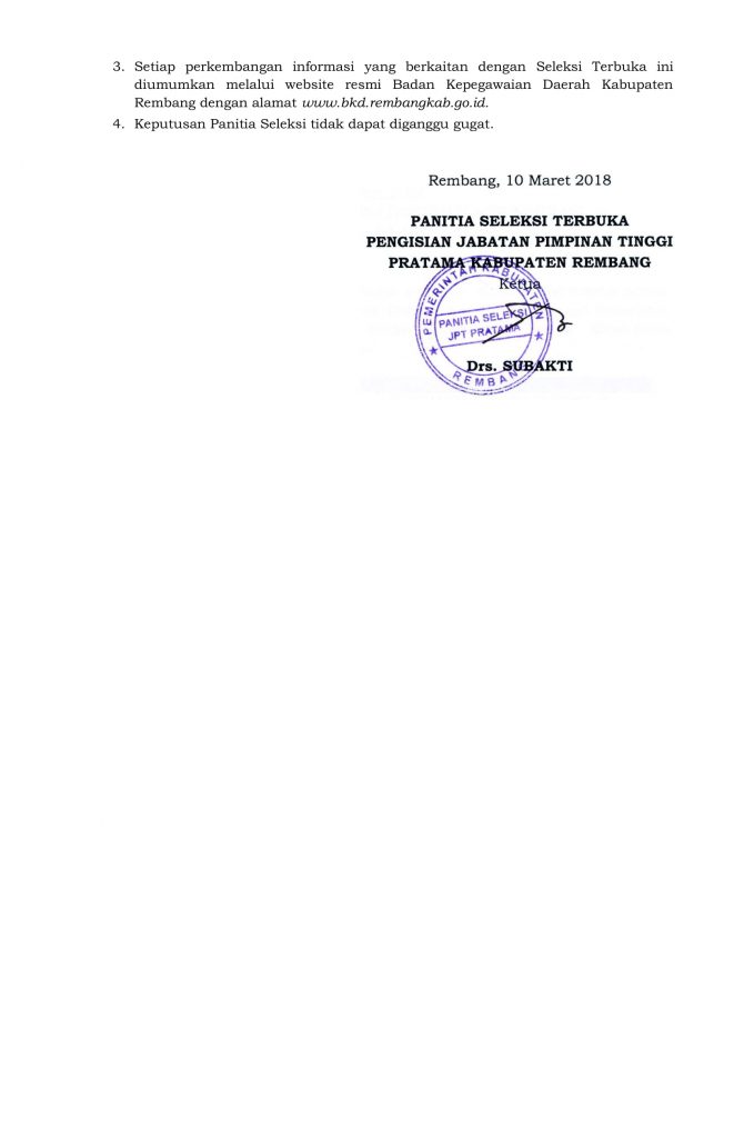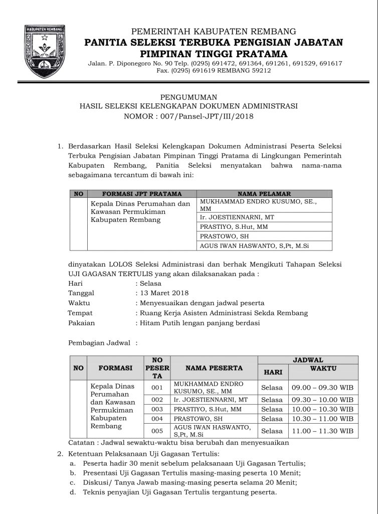 Pengumuman Hasil Seleksi Administrasi Seleksi JPTP Kabupaten Rembang 2018 10 Mar 2018 By Admin Pemkab Rembang | Rembang | Pemerintahan 1 min read Share this Post Pengumunan Hasi Uji Gagasan Tertulis Seleksi JPTP Kabupaten Rembang 2018 Seleksi JPT Pratama Kabupaten Rembang